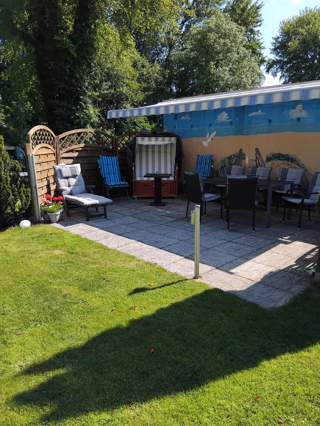 Die von der Küche zu erreichende Terrasse ist mit guten Gartenmöbeln und einem Sonnenschirm ausgestattet. Rasenflächen laden zusätzlich zum Verweilen ein. Außerdem stehen Gartenliegen zur Verfügung. Die möblierte Terrasse in Süd-West-Lage bietet ruhige und entspannte Atmosphäre an sonnigen Tagen.
