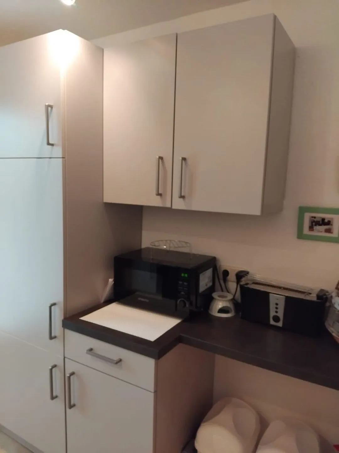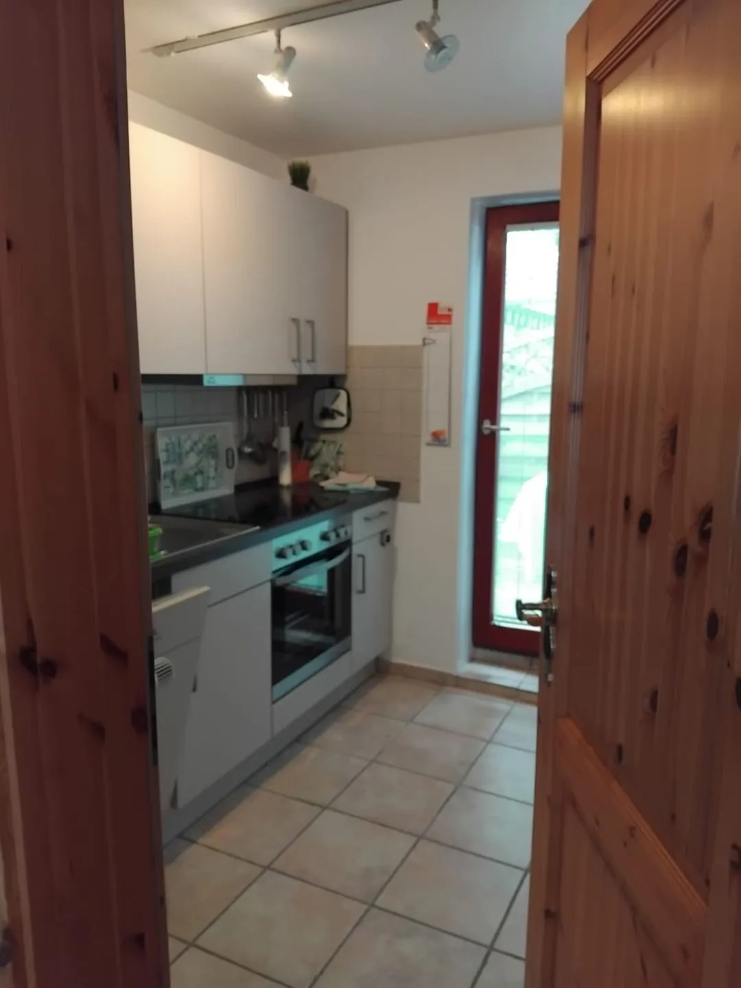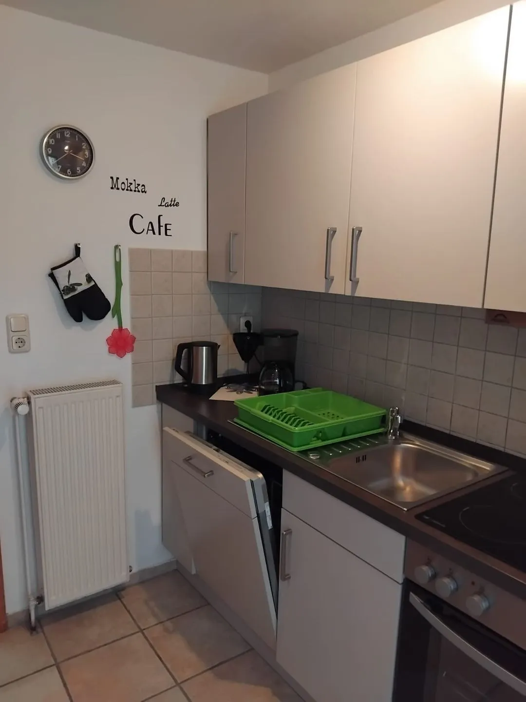 Die am Wohnzimmer angrenzende separate Einbauküche hat ein 4er-Cerankochfeld mit Backofen, Mikrowelle, Wasserkocher, Kaffeemaschine, Toaster, Kühlschrank mit kl. Tiefkühlfach & Geschirrspülmaschine ausgestattet. Selbstverständlich sind ausreichend Geschirr sowie die üblichen Utensilien einer Küche vorhanden.
